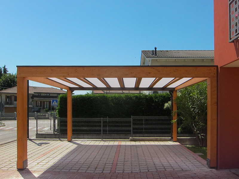 La particolarità di questa soluzione è la gestione delle acque meteoriche: il progetto mantiene un tetto piano privo di pendenza apparente, ma la copertura in policarbonato compatto è installata su guide inclinate rispetto al lato delle travi, così da garantire lo scolo dell’acqua e convogliarla correttamente verso la grondaia. In questo modo si ottiene una linea moderna e pulita, senza rinunciare alla funzionalità.