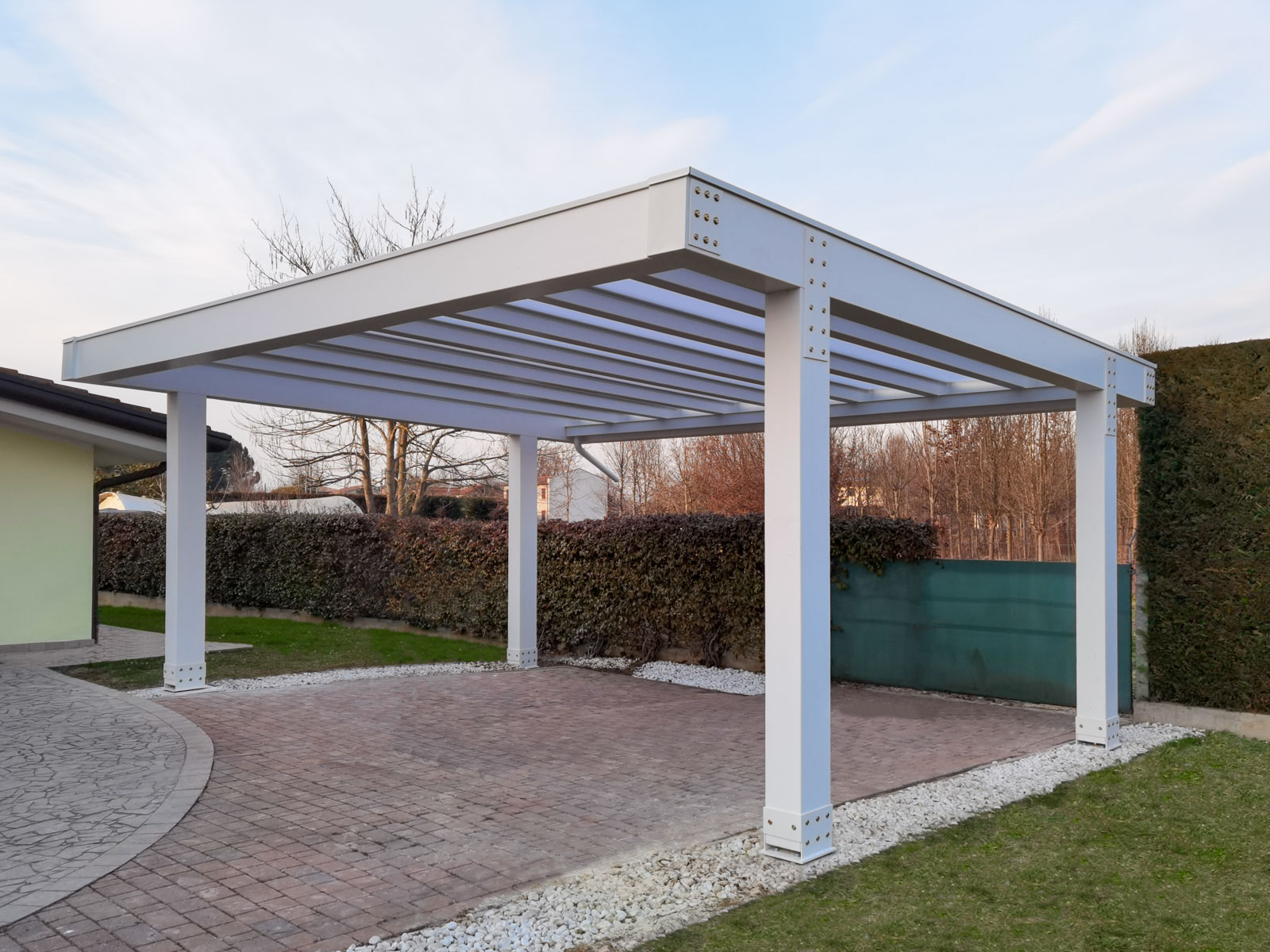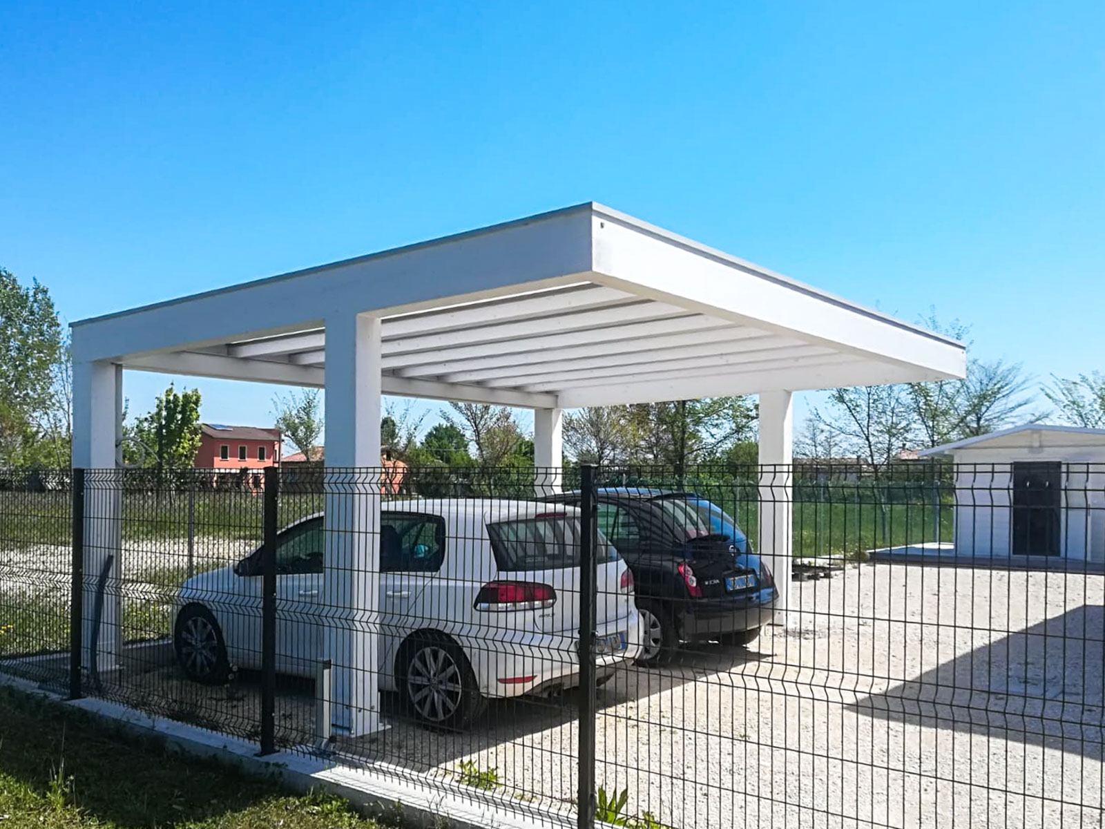 Entrambe le realizzazioni presentano uno sporto anteriore che migliora la fruibilità quotidiana: facilita la manovra d’ingresso e aumenta la zona riparata in corrispondenza del fronte. La copertura è in policarbonato compatto bianco opalino, soluzione ideale per ottenere luce diffusa sotto la struttura e un ottimo livello di protezione dagli agenti atmosferici.