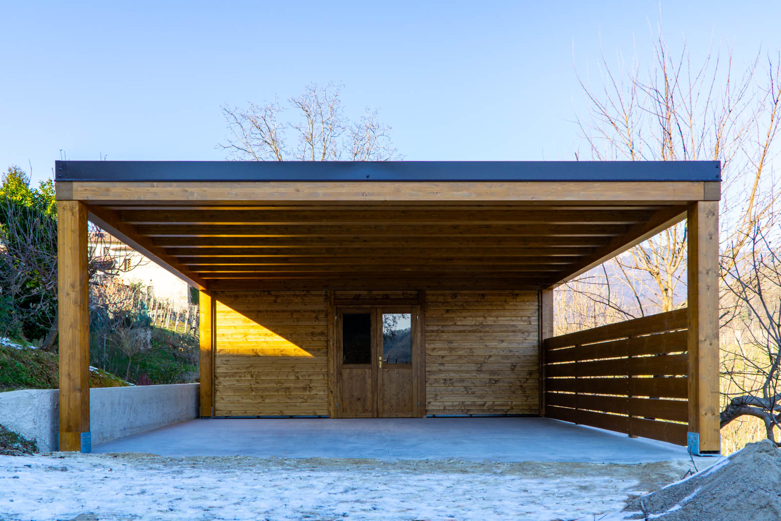 Realizzazione di carport moderno in legno modello Cube, caratterizzato da una linea pulita ed essenziale, con finitura color noce. La struttura integra una zona chiusa sul retro, ideale per creare uno spazio di servizio ordinato e protetto.