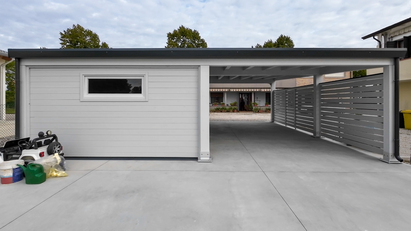 Carport Cube con box integrato, pareti dogate e passaggio sul fondo