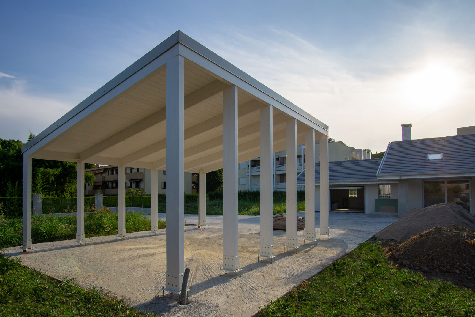 Questa realizzazione mostra la struttura Design Delta in configurazione carport, pensata specificamente per il posteggio auto. La firma estetica è data dal tetto a pendenza pronunciata e dal ritmo regolare degli elementi verticali, che rendono l’insieme moderno e ordinato.
