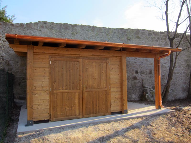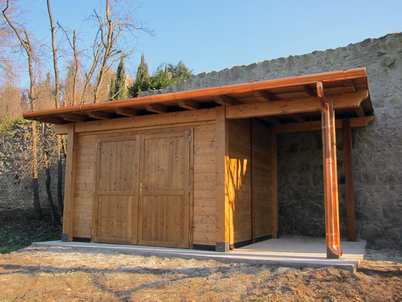Casetta in legno per giardino ad uso ricovero attrezzi con tetto monofalda, realizzata con struttura portante in travature di abete rosso lamellare certificato verniciato noce 027. Pareti in tavolato maschiato spessore mm. 33 con doppio trattamento protettivo ambo i lati (finitura all'acqua impermeabilizzante su lato esterno) con sigillatura a schiuma poliuretanica a pavimento entro profili di zoccolo perimetrali. Porta in legno cieca doppia (cm. 180 x 200) completa di maniglia e serratura, con cerniere registrabili su due assi e di produzione artigiana italiana.
