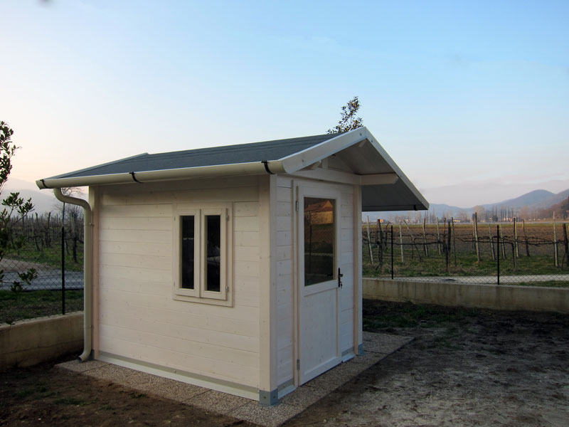 Piccola casetta in legno da giardino con tetto a doppia falda e struttura portante in travature lamellari di abete rosso. Solide pareti in tavolato maschiato spessore mm. 33 con doppio trattamento protettivo interno ed esterno (finitura all'acqua impermeabilizzante su lato esterno). Porta in legno anteriore cm. 90x200 completa di maniglia e serratura e con cerniere registrabili; finestra laterale a doppia anta dimensioni cm. 80x100 con vetri stratificati 3+3. Copertura con perlinato spessore mm. 33 con doppio trattamento protettivo e guaina ardesiata adesiva grigia. Nessuna vite a vista esternamente. Profili angolari interni copri-viti (nessuna vite a vista). Lattoneria completa e grondaie con eleganti cicogne di sostegno e scarichi a terra. Zoccolo perimetrale esterno con sigillatura a schiuma poliuretanica a pavimento.