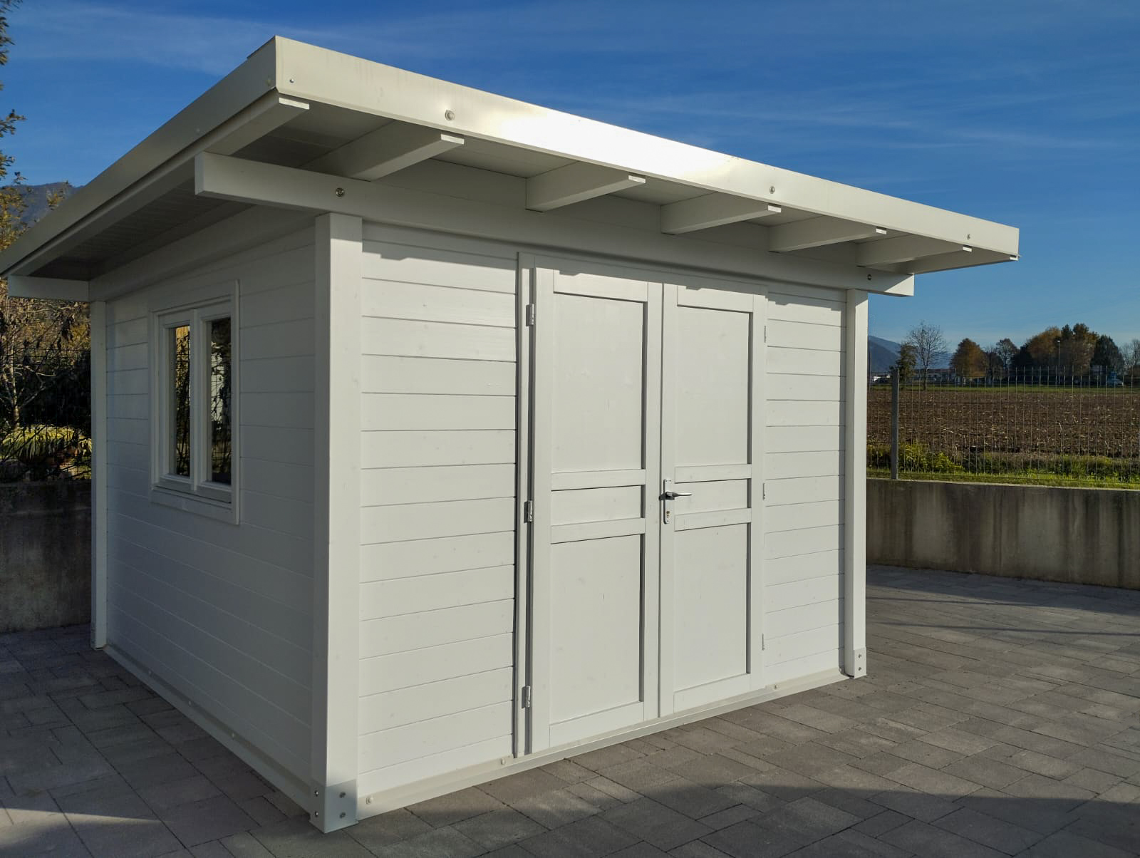 Questa tipologia di casetta è particolarmente indicata come magazzino esterno o spazio di servizio, grazie alla sua struttura compatta e funzionale.