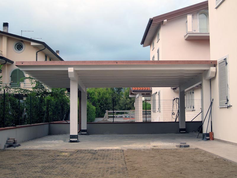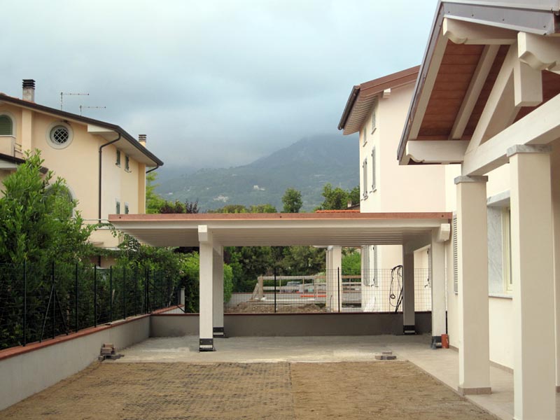 Grazie alla sua configurazione, la pergola viene utilizzata anche come posto auto coperto, offrendo protezione senza appesantire l’impatto visivo dell’insieme.