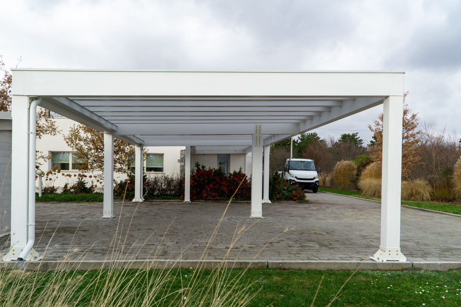 Realizzazione di grande carport moderno in legno modello Cube in finitura bianca, sviluppato come struttura modulare di notevole estensione. Il progetto nasce dall’abitazione: la copertura crea una zona riparata tipo pergola in corrispondenza dell’ingresso, e prosegue poi in lunghezza con altri due moduli biposto, ottenendo un’area di parcheggio ampia e ordinata.
