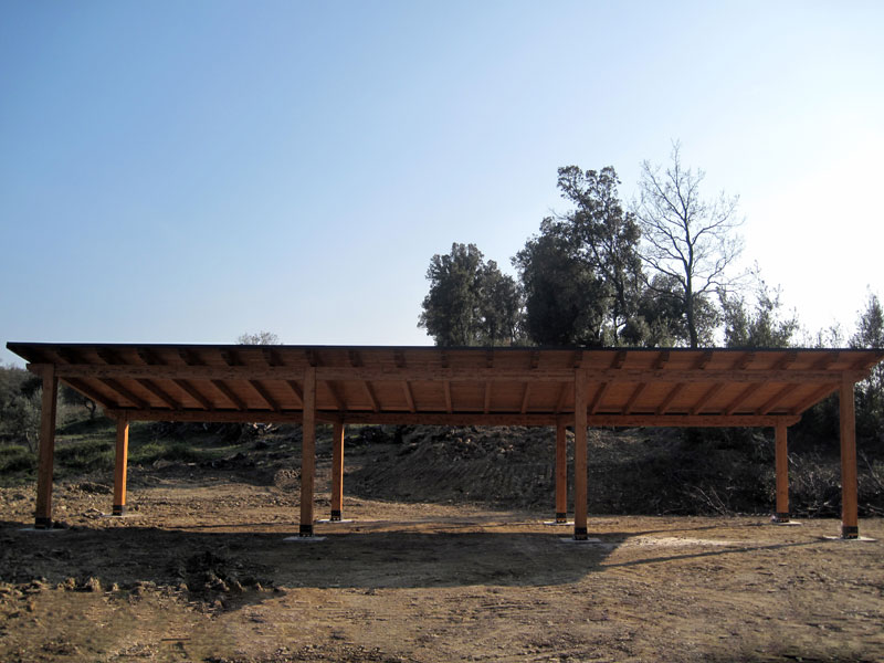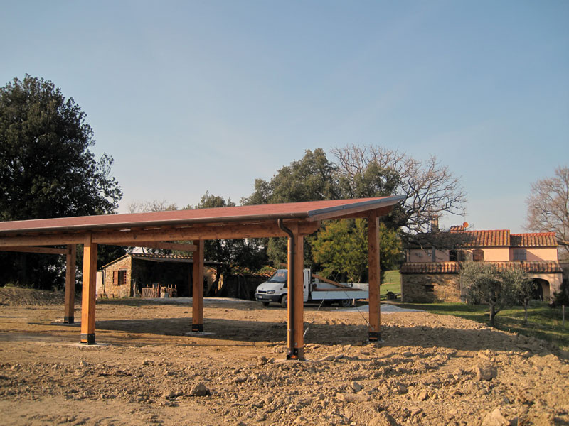 Pensilina fotovoltaica in legno lamellare basata sul carport modello Classic per sei posti auto (tre moduli doppi), con copertura in perlinato maschiato e guaina ardesiata adesiva 4 kg. mq. (installazione successiva dei pannelli fotovoltaici). Struttura completa di puntoni e controventature in cavo d'acciaio.
