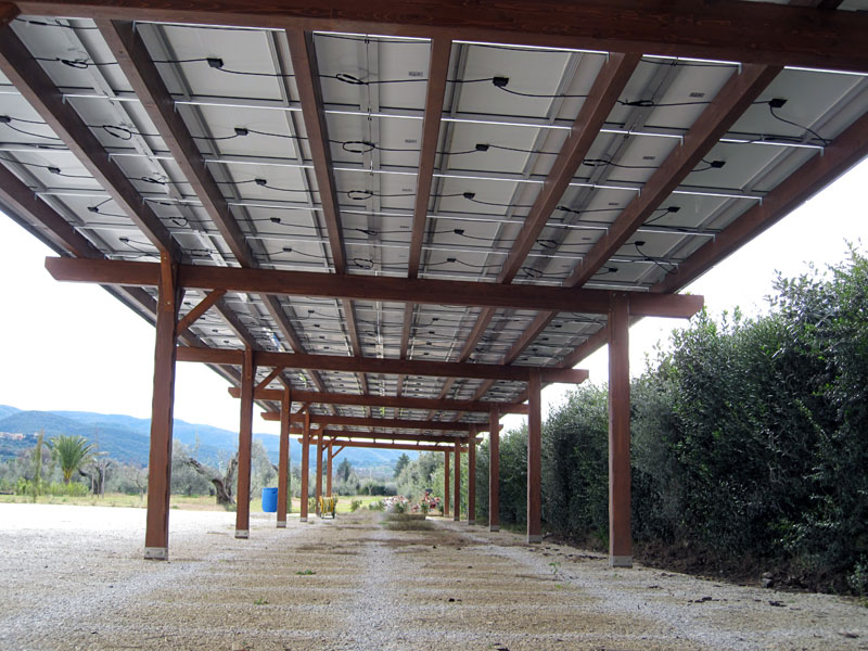 Quella visibile in queste foto è una semplice tettoia in legno per la posa di un impianto fotovoltaico installata come parcheggio in un agriturismo toscano. Strutturata in sette moduli auto biposto, la tettoia fotovoltaica funge da solo ombreggiamento in quanto i pannelli fotovoltaici sono posati direttamente sugli arcarecci della struttura, senza l'impermeabilizzazione di un tetto in perlinato e guaina oppure di un sistema di guarnizione per i pannelli stessi.
