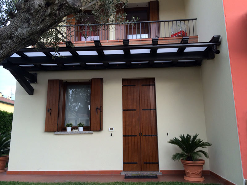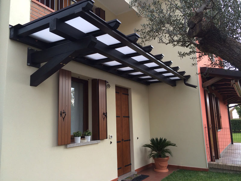 Pensilina in legno di abete rosso lamellare contemporanea verniciata colore nero poro aperto (venature a vista) in contrasto con copertura in policarbonato compatto Bayer Macrolon ANTI-UV mm.4 opale bianco - sistema PolyX rimovibile.