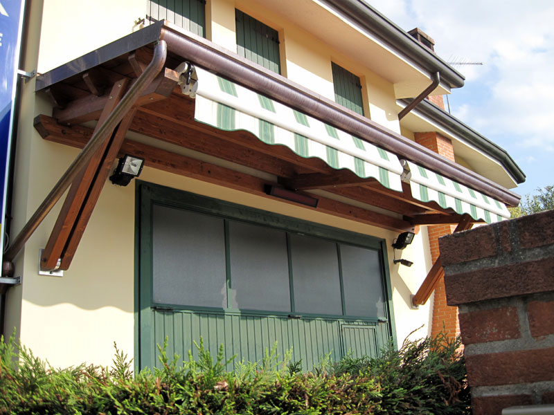 Altra grande pensilina in lamellare di abete rosso modello Classic a riparo portone d'ingresso di un laboratorio, con significativa campata unica di ben sei metri senza puntoni intermedi. La copertura della pensilina è supportata da travature lamellari di opportuna sezione ed è formata da perline di spessore mm.20, guaina ardesiata adesiva 4 kg. mq. rossa e completa di lattoneria. Si notino le particolari staffe a muro in alluminio tornito per aggancio dei puntoni gemellati.
