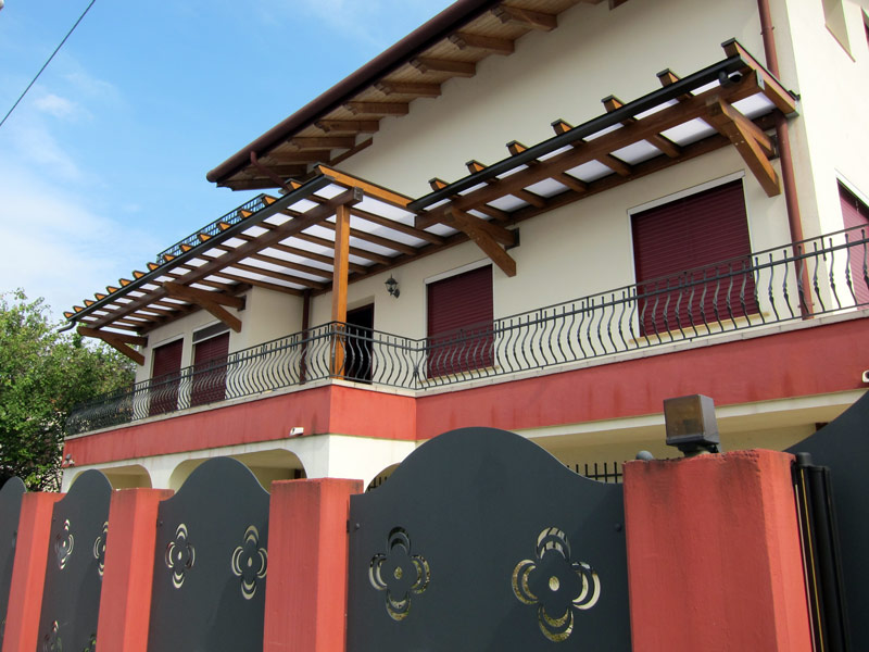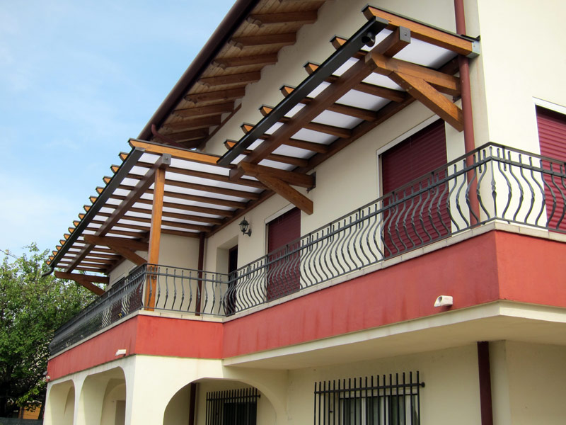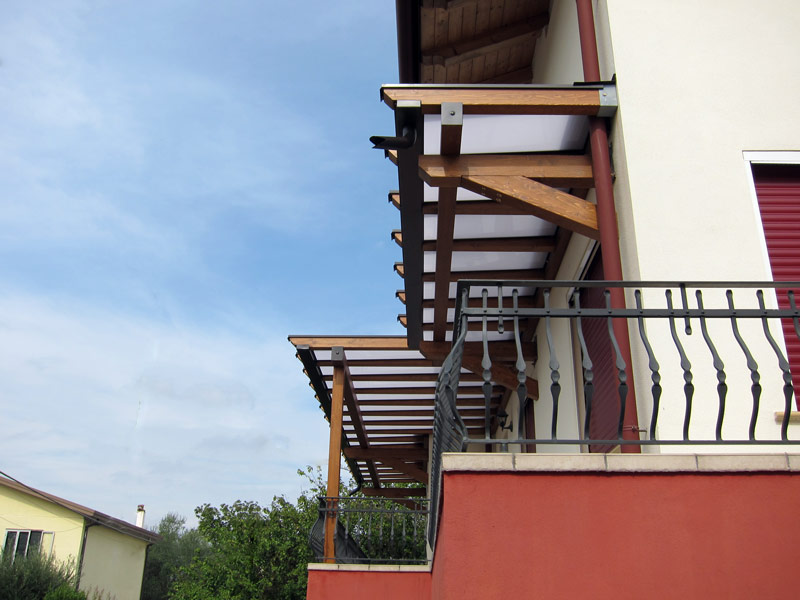 Pensilina moderna in legno con copertura in policarbonato modello PolyLine di grande impatto estetico installata su terrazzo, con tre diverse profondità di copertura, verniciata colore noce 027 e con copertura in policarbonato compatto Bayer Macrolon ANTI-UV mm.4 opale bianco - sistema PolyX semiremovibile.