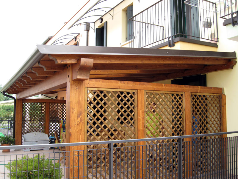 Pergola in legno tradizionale con copertura completa e schermature laterali