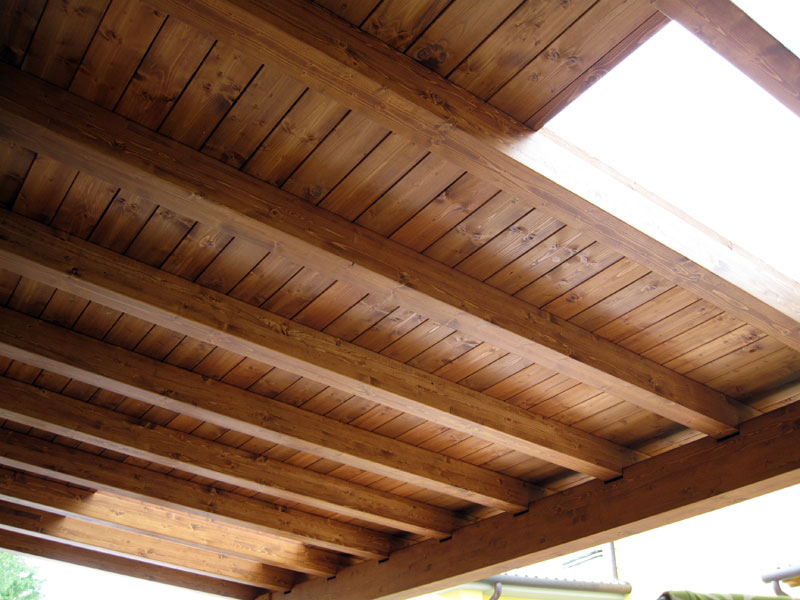 La struttura è realizzata in abete rosso lamellare con finitura colore Douglas, lavorata e trattata per garantire durata nel tempo e un aspetto naturale coerente con l’architettura dell’abitazione.