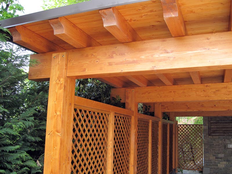 I lati della pergola sono completati da pannelli grigliati in legno con maglia diagonale stretta, incorniciati da travetti in legno lamellare e rifiniti nello stesso colore della struttura, contribuendo a creare una schermatura elegante e coerente.