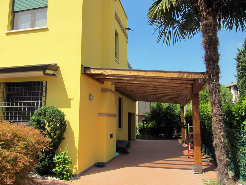 La struttura è realizzata in abete rosso lamellare con finitura colore Douglas. La copertura è composta da policarbonato compatto Bayer Macrolon da 4 mm, nella versione completamente trasparente con trattamento anti-UV, scelta che consente di ottenere massimo passaggio di luce naturale sotto la struttura.