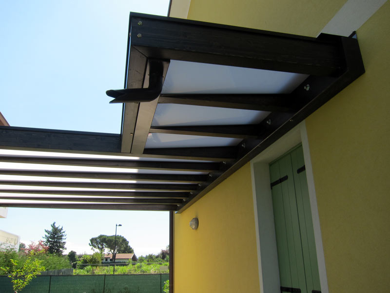 Il tetto piano (senza pendenze visibili) mantiene una linea pulita e non appesantisce la facciata. La copertura in policarbonato opalino bianco garantisce protezione e al tempo stesso una buona traslucidità, ideale per ottenere una zona esterna ariosа e luminosa, perfetta per pranzi, relax e momenti conviviali.