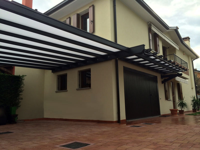 Il pergolato è completato da una pensilina in continuità, realizzata con lo stesso sistema costruttivo, a protezione dell’ingresso garage, creando un insieme coerente e funzionale.