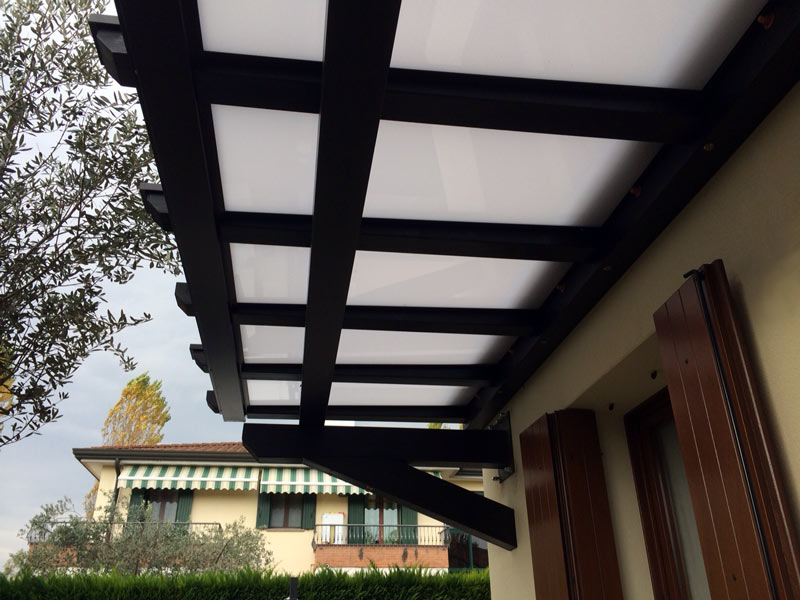 La copertura è composta da policarbonato compatto Bayer Macrolon da 4 mm con trattamento anti-UV, installato con sistema PolyX semiremovibile, che consente di mantenere luminosità sotto la struttura garantendo allo stesso tempo protezione dagli agenti atmosferici.
