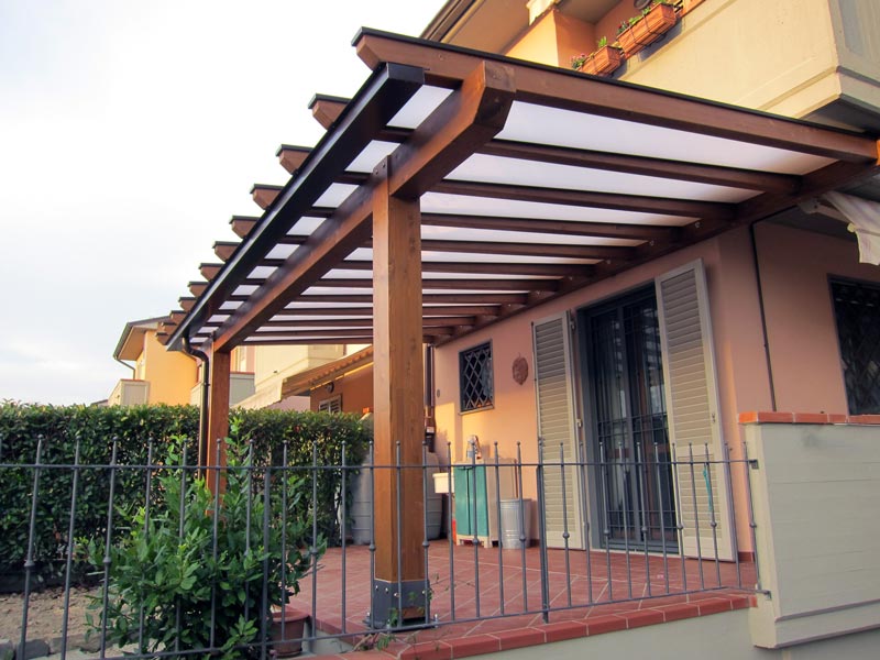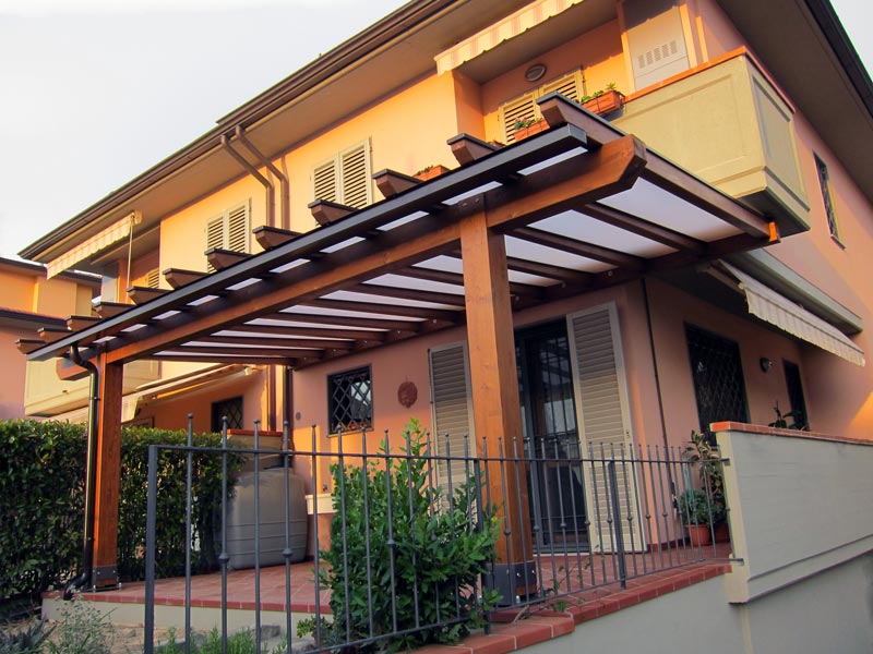 Pergola in legno per ingresso casa con copertura ombreggiante ma luminosa