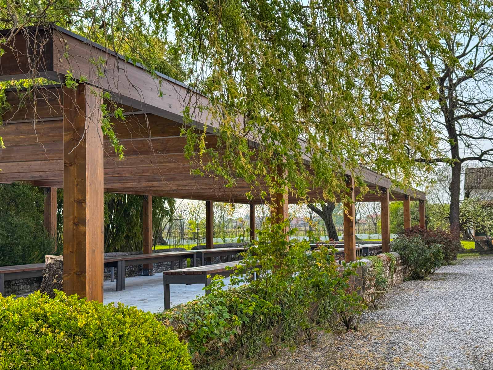 Realizzazione di pompeiana in legno stile Cube (struttura senza copertura), progettata come grande spazio d’incontro all’aperto all’interno di una cantina del trevigiano. Con una superficie di oltre 90 m², la struttura crea un’area ombreggiante e ordinata, ideale per meeting, degustazioni ed eventi aziendali.