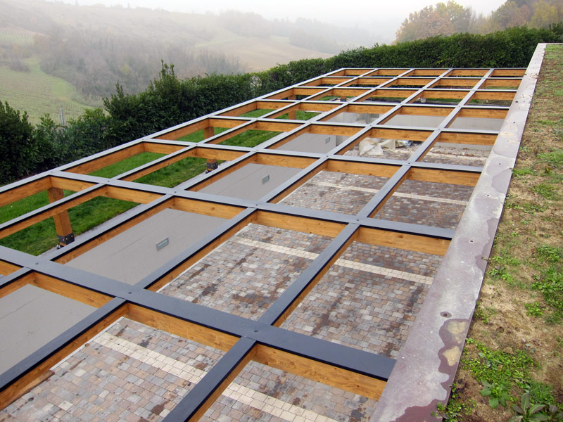 Per aumentare la durabilità in un contesto esposto, le travi sono protette nella parte superiore da profili copritrave in lamiera zincata preverniciata colore testa di moro. L’insieme unisce un forte impatto estetico a una soluzione pratica di protezione delle parti più sollecitate dagli agenti atmosferici.