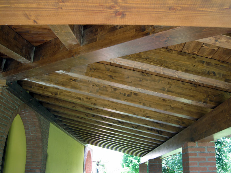 Portico in legno ad angolo con copertura tradizionale in coppo