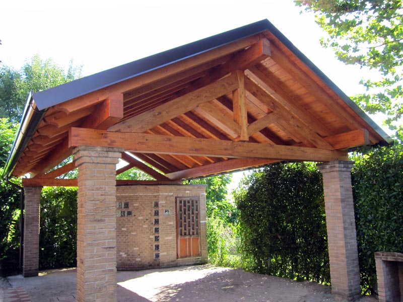 Tettoia in legno lamellare con capriate e pilastri in pietra faccia vista - C108