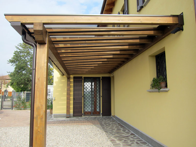 Pergola in legno addossata per ingresso casa senza pendenza del tetto